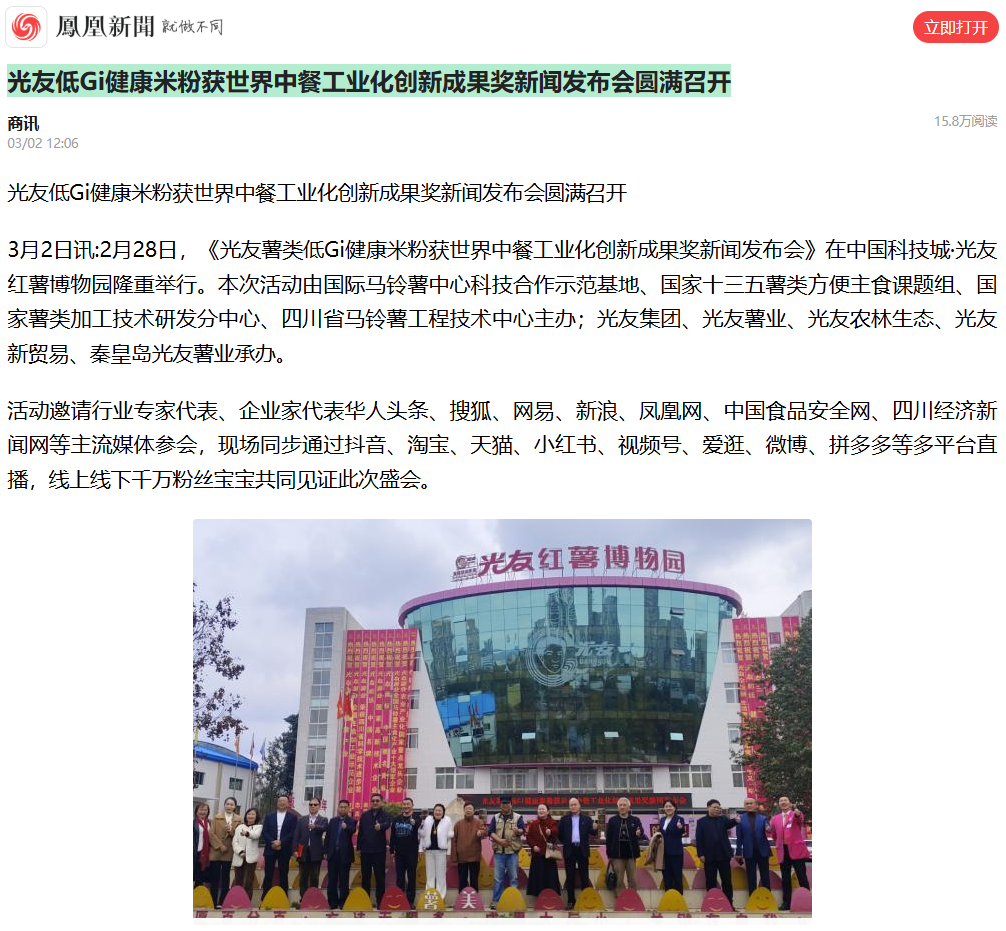 轉(zhuǎn)載鳳凰網(wǎng):光友低Gi健康米粉獲世界中餐工業(yè)化創(chuàng)新成果獎新聞發(fā)布會圓滿召開