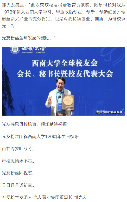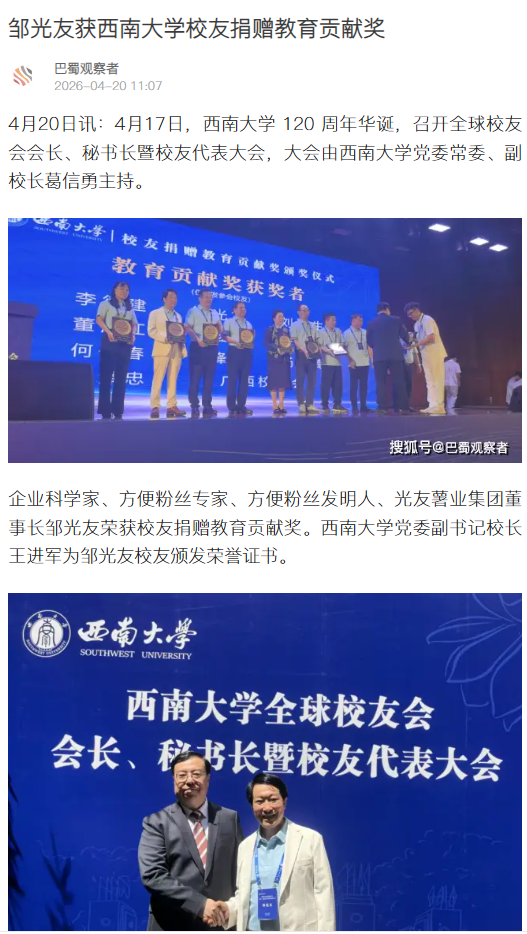 轉(zhuǎn)載巴蜀觀察者 鄒光友獲西南大學(xué)校友捐贈教育貢獻獎