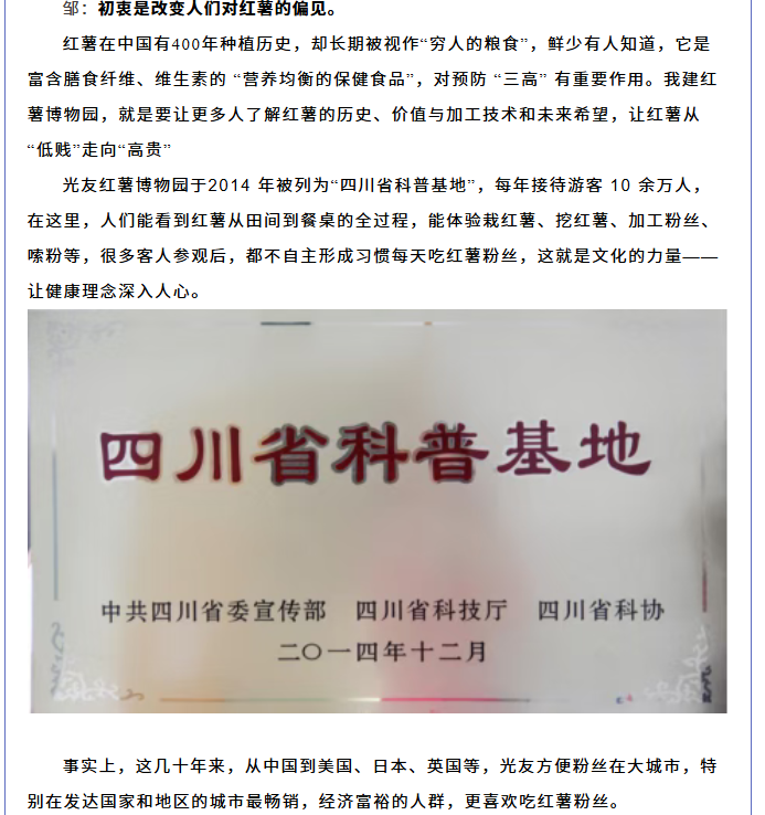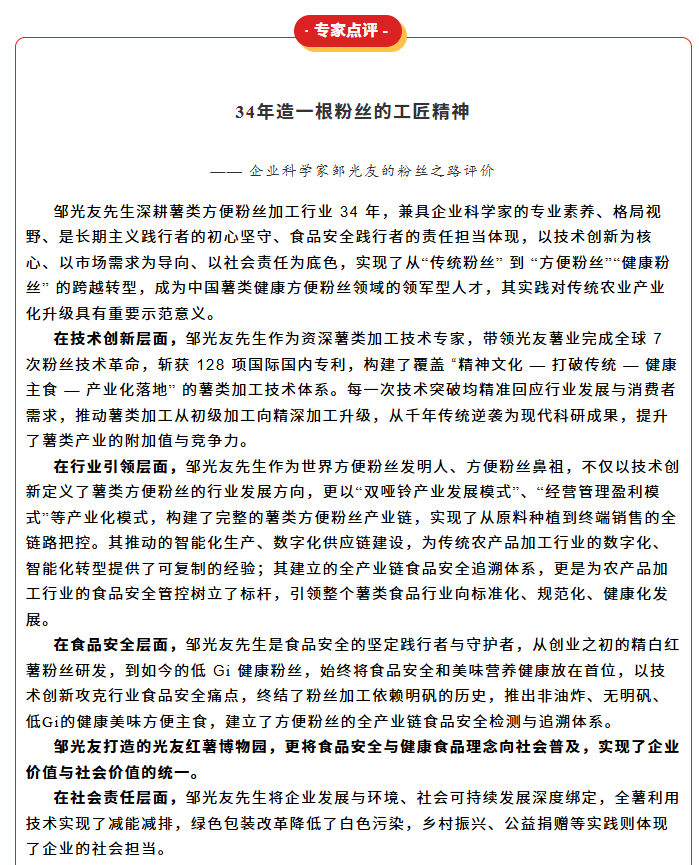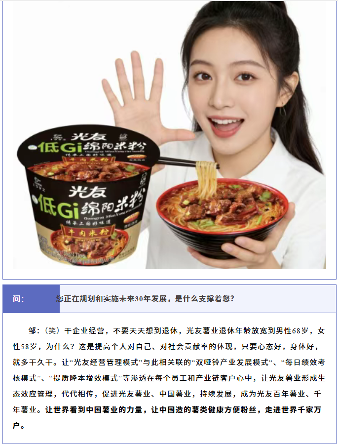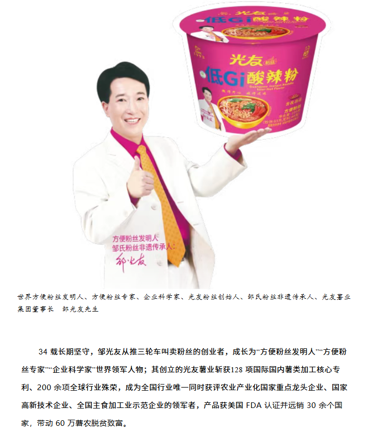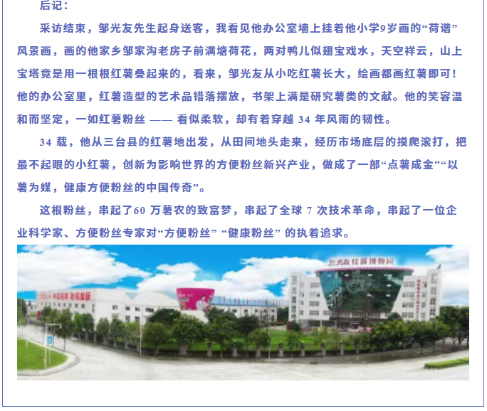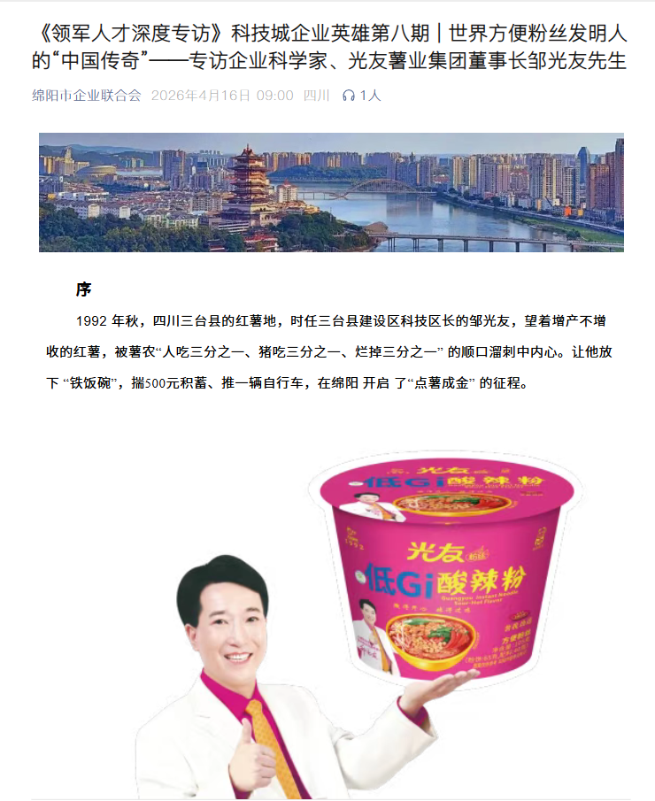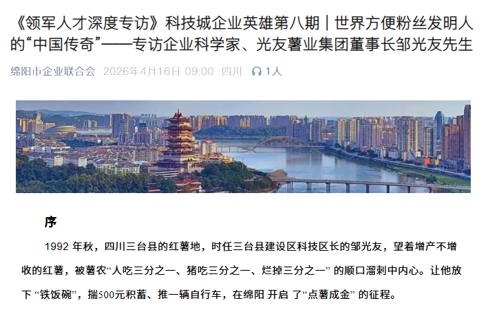 轉載綿陽市企業(yè)聯(lián)合會 《領軍人才深度專訪》科技城企業(yè)英雄第八期 | 世界方便粉絲發(fā)明人的“中國傳奇”——專訪企業(yè)科學家、光友薯業(yè)集團董事長鄒光友先生
