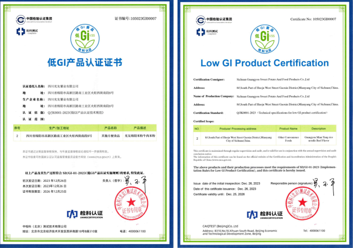 光友32年打造薯類方便主食健康品質(zhì):光友薯業(yè)32年來,專做健康薯業(yè),在中國乃至世界把紅薯、馬鈴薯做成一大健康主食產(chǎn)業(yè)。光友薯業(yè)歷經(jīng)32年來,光友綿陽米粉低GI健康方便主食發(fā)布,是繼光友酸辣粉低GI健康方便主食后,又一個健康爆款產(chǎn)品上市。光友低GI健康薯類方便主食是經(jīng)光友薯業(yè)技術(shù)創(chuàng)新,經(jīng)國家權(quán)威檢測機構(gòu)營養(yǎng)成分檢測和臨床試驗,取得低GI食品報告,由中國權(quán)威認證機構(gòu)中檢科檢測后,為光友薯業(yè)頒發(fā)了光友綿陽米粉低GI健康方便主食認證證書,這是線上線下各位領(lǐng)導(dǎo)、嘉賓、朋友,關(guān)心支持光友32年來共同取得的成果!