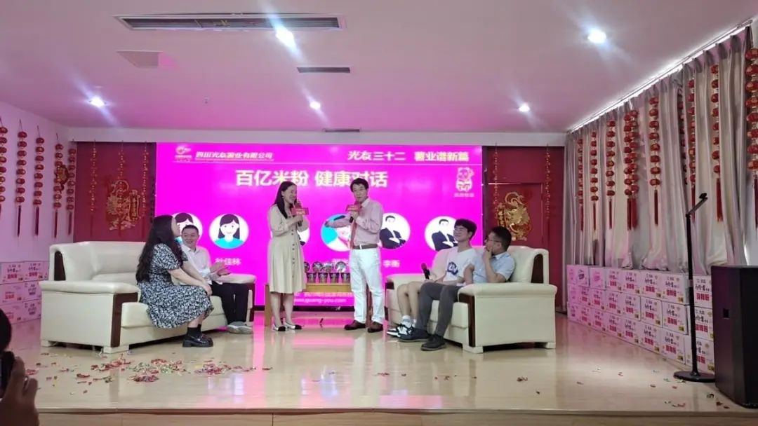 為更直觀地了解光友薯類健康主食,本次活動(dòng)還特別邀請(qǐng)五位嘉賓上臺(tái)與鄒光友董事長(zhǎng)現(xiàn)場(chǎng)健康對(duì)話,對(duì)話的嘉賓分別是綿陽(yáng)城市學(xué)院雙創(chuàng)中心主任李衡、綿陽(yáng)市靖華節(jié)能環(huán)??萍级麻L(zhǎng)王華、四川敬科智能裝備科技副總經(jīng)理肖飛雨、綿陽(yáng)西城大學(xué)生創(chuàng)新創(chuàng)業(yè)園創(chuàng)業(yè)導(dǎo)師杜佳林、綿陽(yáng)城市學(xué)院雙創(chuàng)中心何愛清,與會(huì)嘉賓在這里共同探討米粉行業(yè)的未來(lái)發(fā)展趨勢(shì)及健康飲食的重要性,共享基地帶動(dòng)大學(xué)生創(chuàng)新創(chuàng)業(yè)發(fā)展。