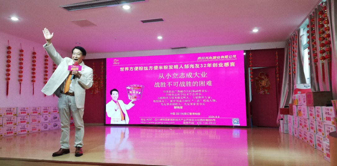 活動前預熱環(huán)節(jié),一段活力四射的光友粉絲舞視頻讓現(xiàn)場氣氛瞬間升溫。隨后,方便粉絲方便米粉發(fā)明人、光友薯業(yè)集團董事長鄒光友發(fā)表熱情洋溢的歡迎辭,并深情分享《從小立志成大業(yè) 戰(zhàn)勝不可戰(zhàn)勝的困難》的感言,鼓勵小記者們勇于面對挑戰(zhàn)面對困難,追求夢想。在互動環(huán)節(jié),小記者們積極提問,鄒董事長一一耐心解答,并親手為提問的小記者們贈送《光友詩選》,每本書上都附有鄒董事長親筆簽名及溫馨寄語,傳遞著對下一代的殷切期望。