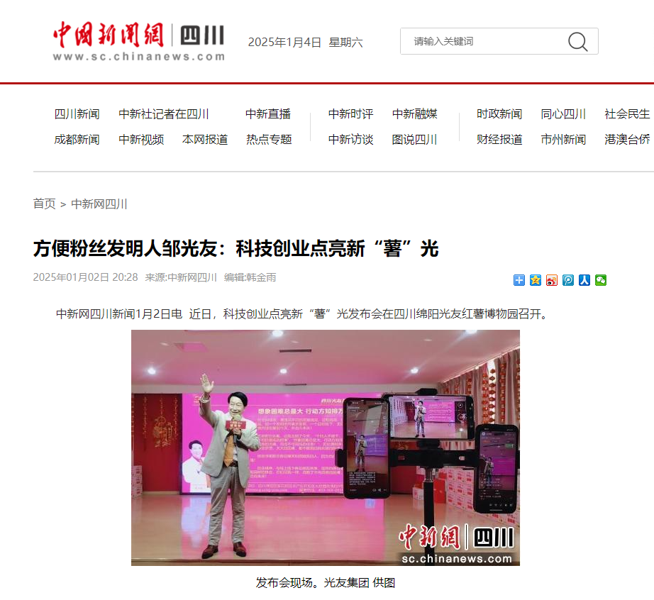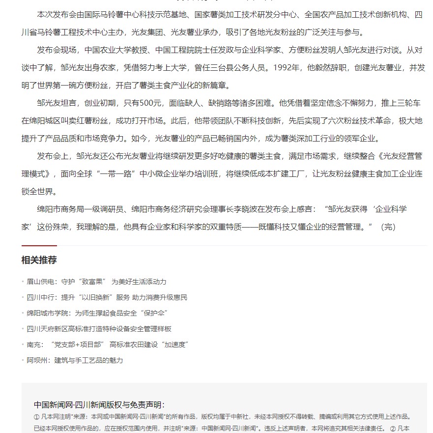 轉載中國新聞網·四川新聞——方便粉絲發(fā)明人鄒光友:科技創(chuàng)業(yè)點亮新“薯”光