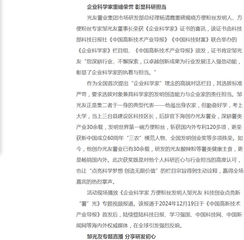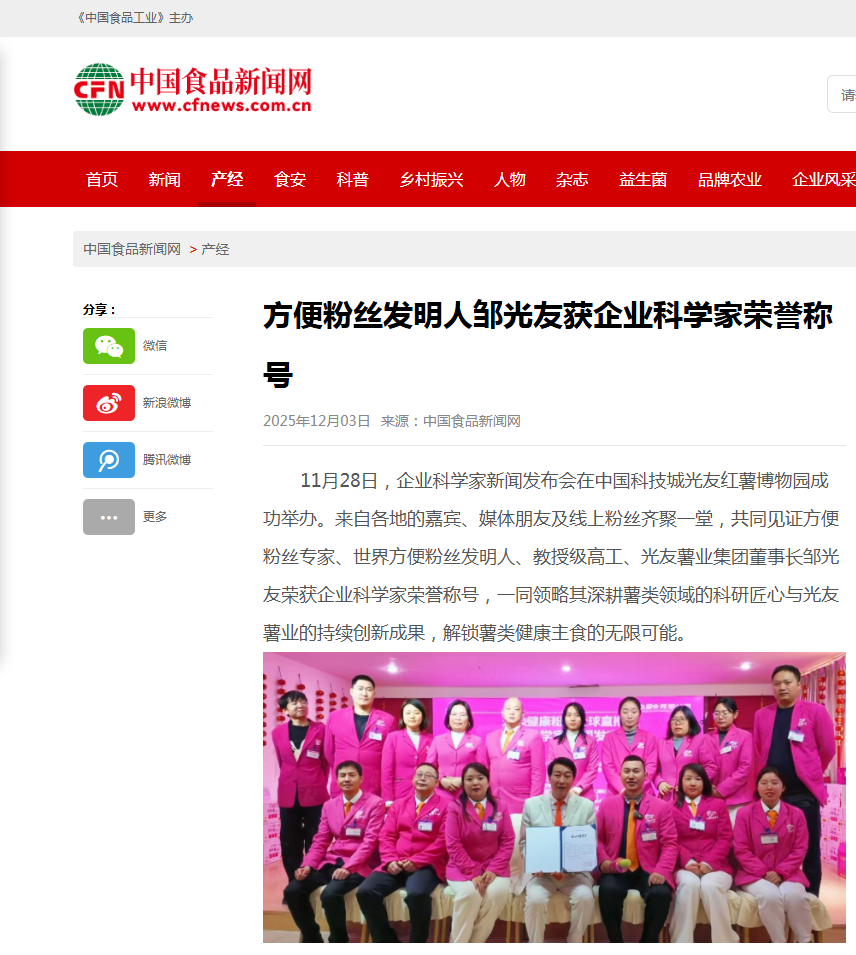 方便粉絲發(fā)明人鄒光友獲企業(yè)科學(xué)家榮譽(yù)稱號(hào)